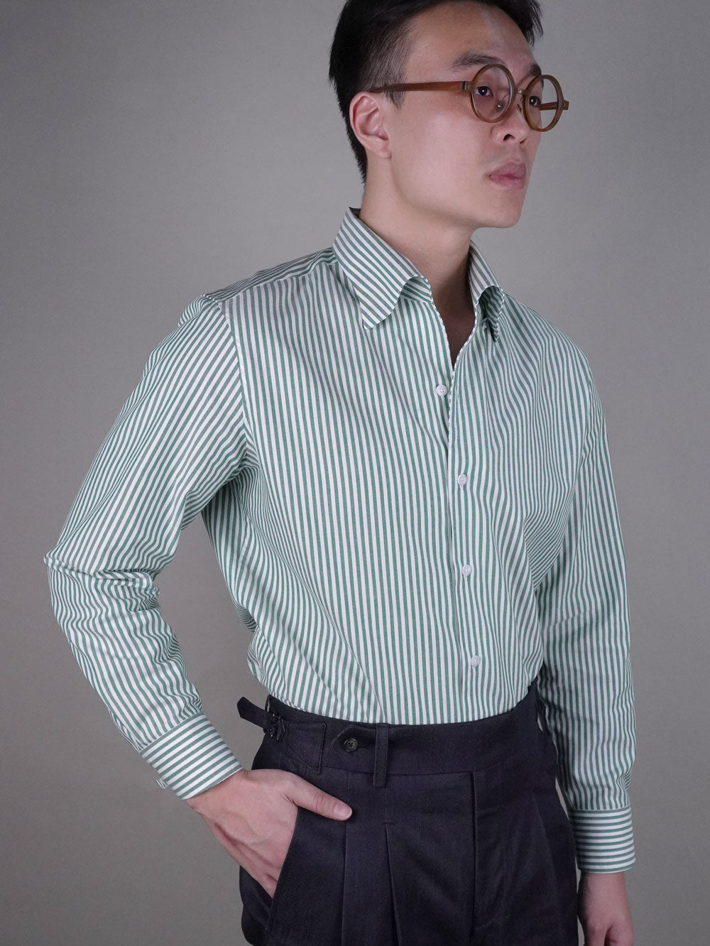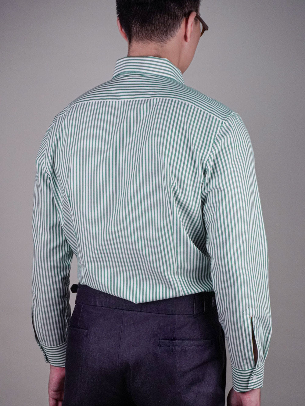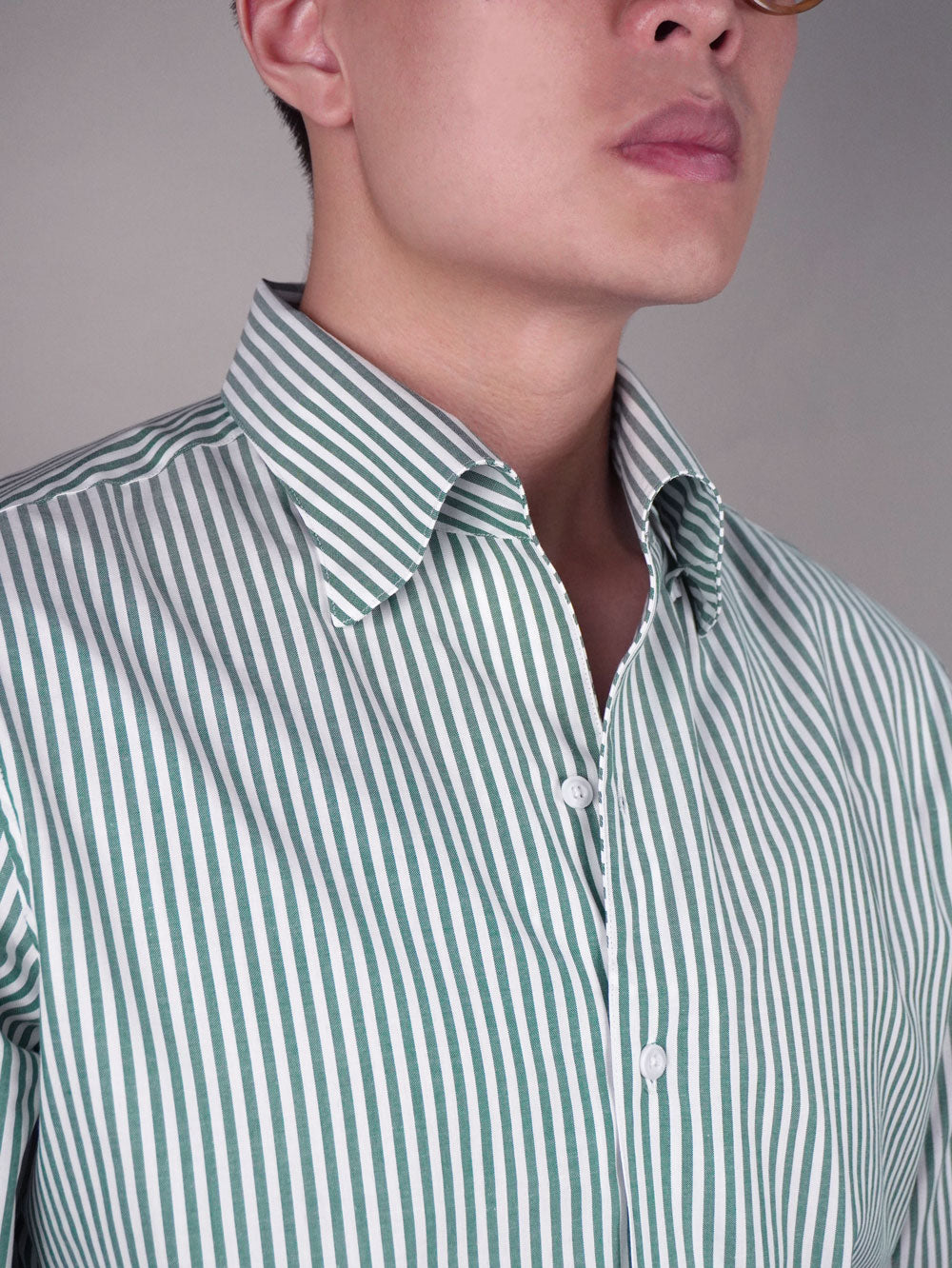 This business shirt is crafted from fine Egyptian cotton woven in crisp green and white stripes, offering a fresh interpretation of classic shirting. Renowned for its superior softness and strength, the fabric feels smooth and breathable against the skin, providing all-day comfort while maintaining a structured, polished look. Its subtle sheen and refined pattern make it equally suited for professional and smart-casual occasions.