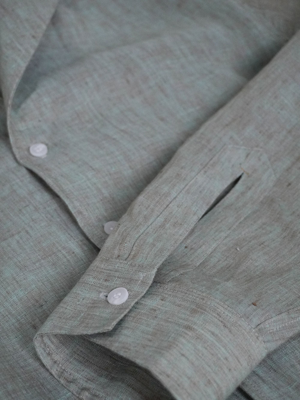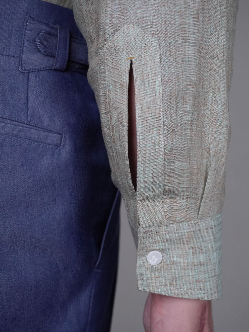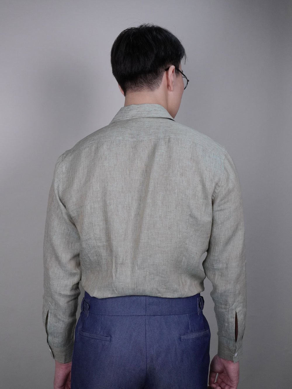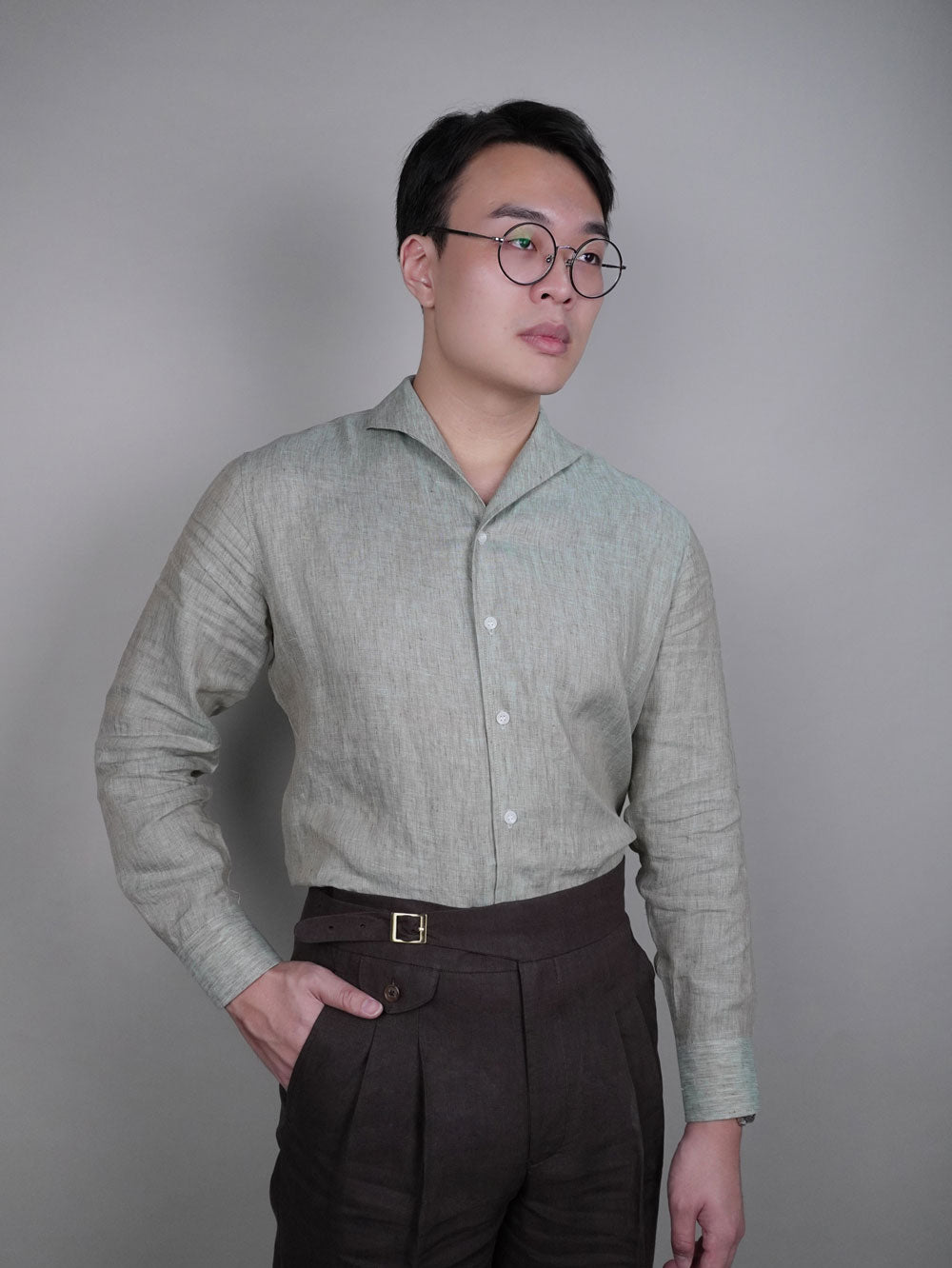 The shawl collar, known for its cut-away design, frames the face with a flattering, masculine balance, creating a refined appearance. The collar's rounded, flowing shape provides a timeless yet relaxed silhouette, effortlessly blending formality with comfort. Whether styled for business or leisure, the shirt maintains its structure, thanks to the linen's natural drape and durability.