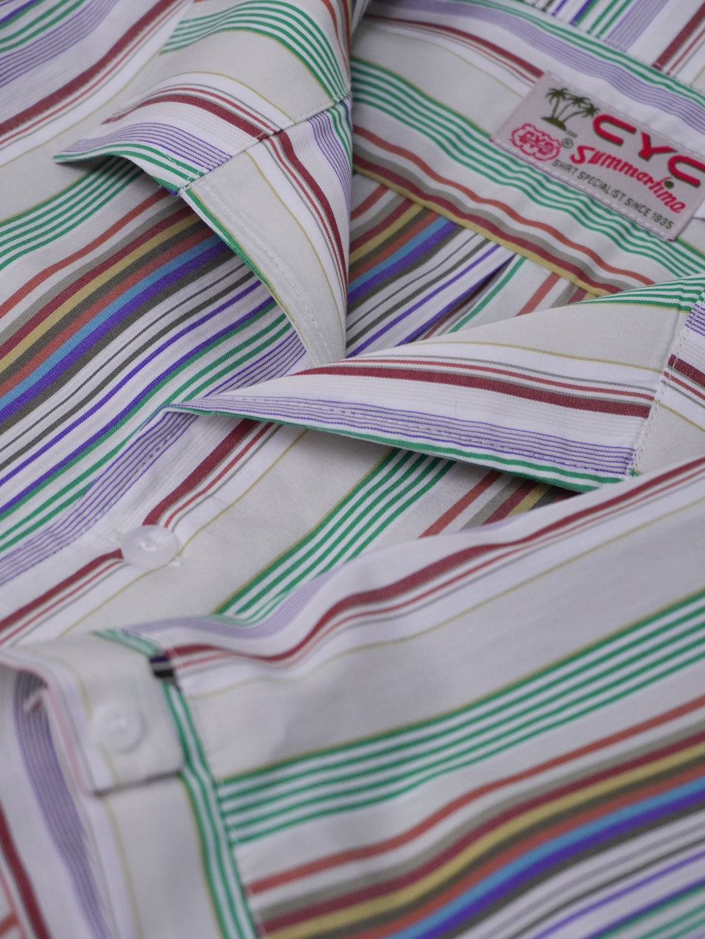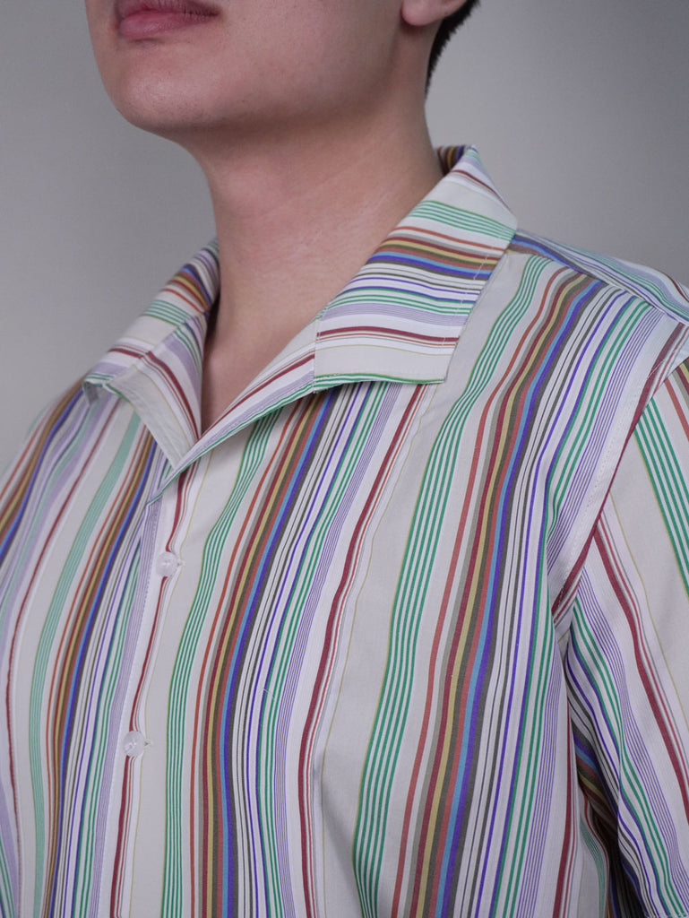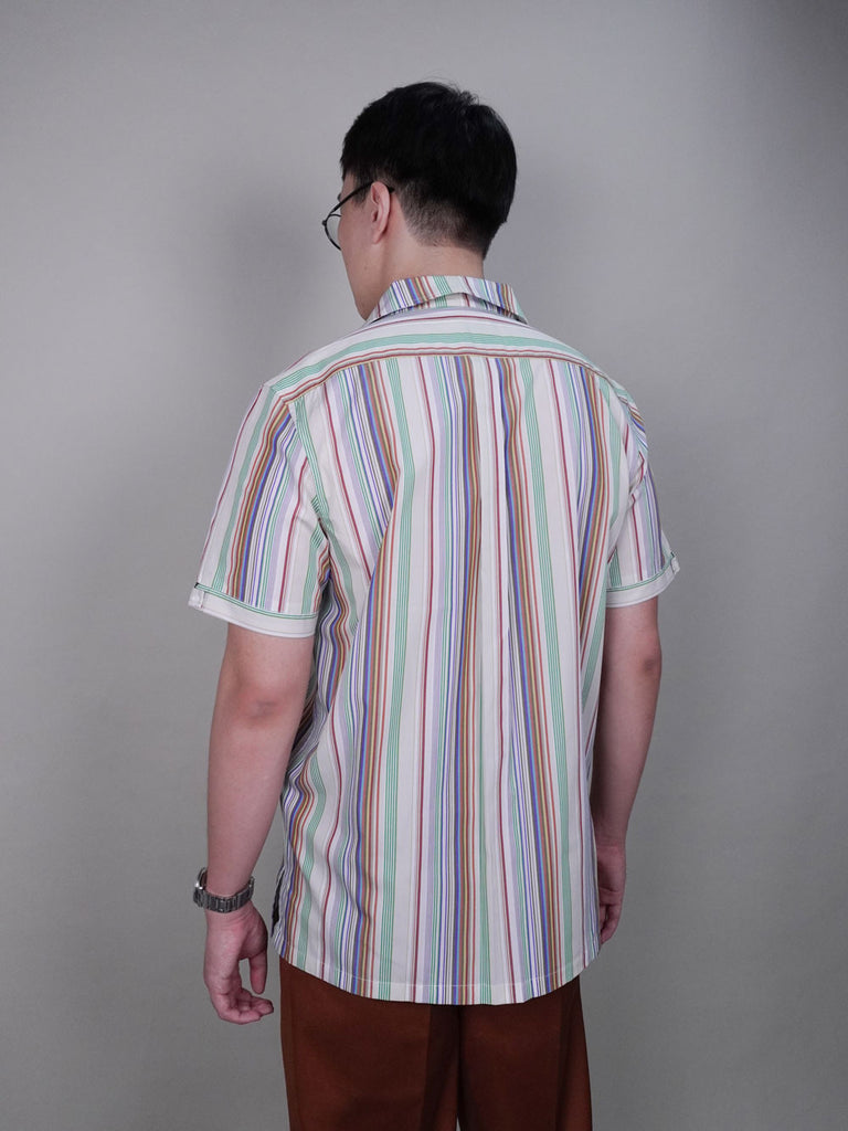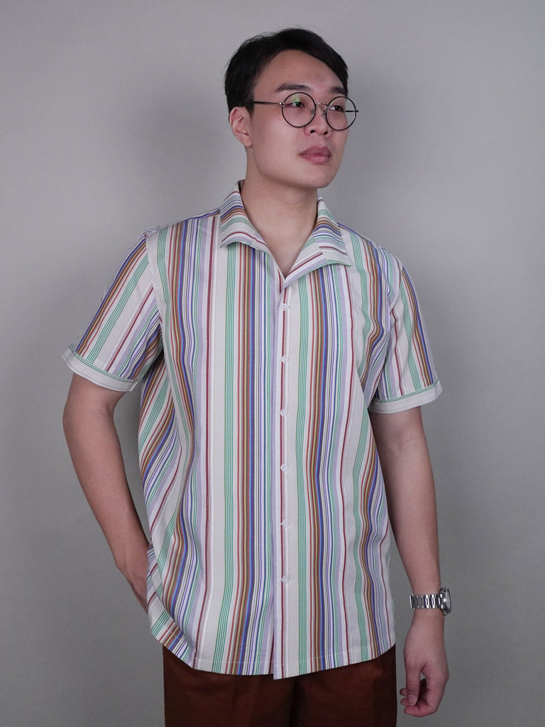 This multicolour striped short sleeve shirt combines a shawl-style collar with a relaxed fit, offering bold stripes that add a vibrant touch to your wardrobe. Designed for a sophisticated yet casual and fun style, it’s perfect for effortless, stylish comfort in warm weather.