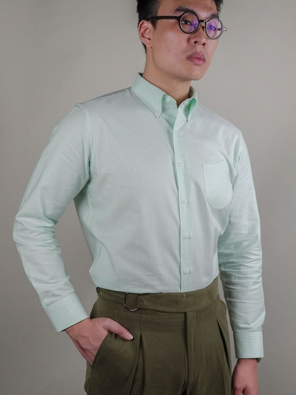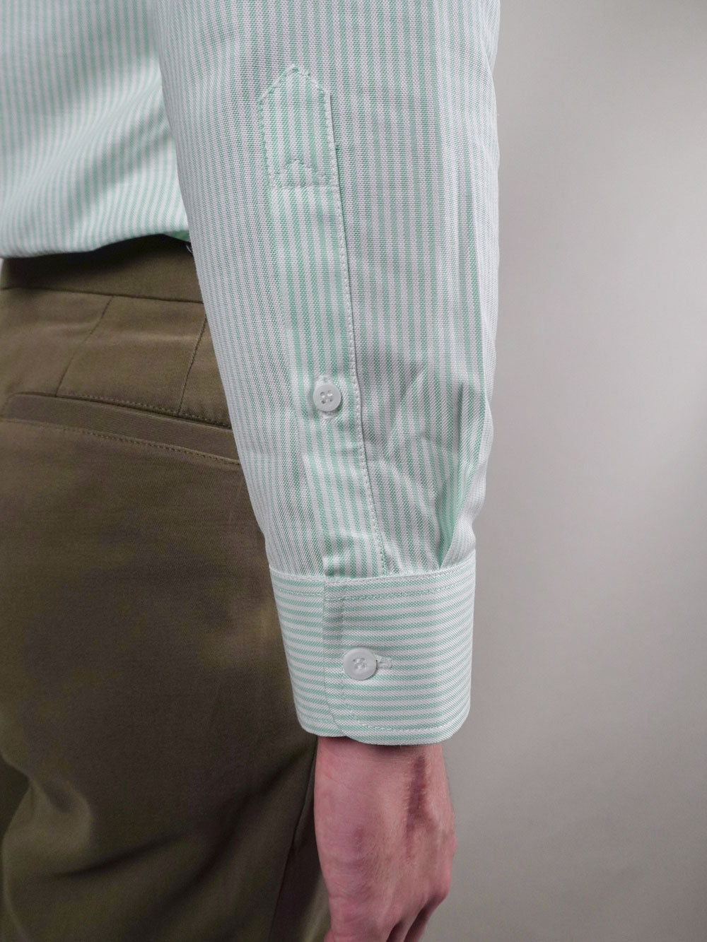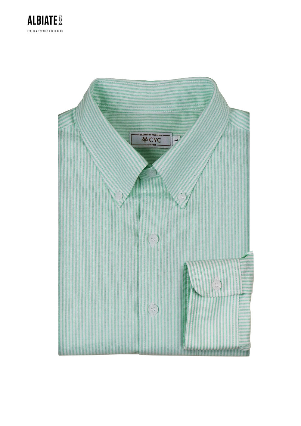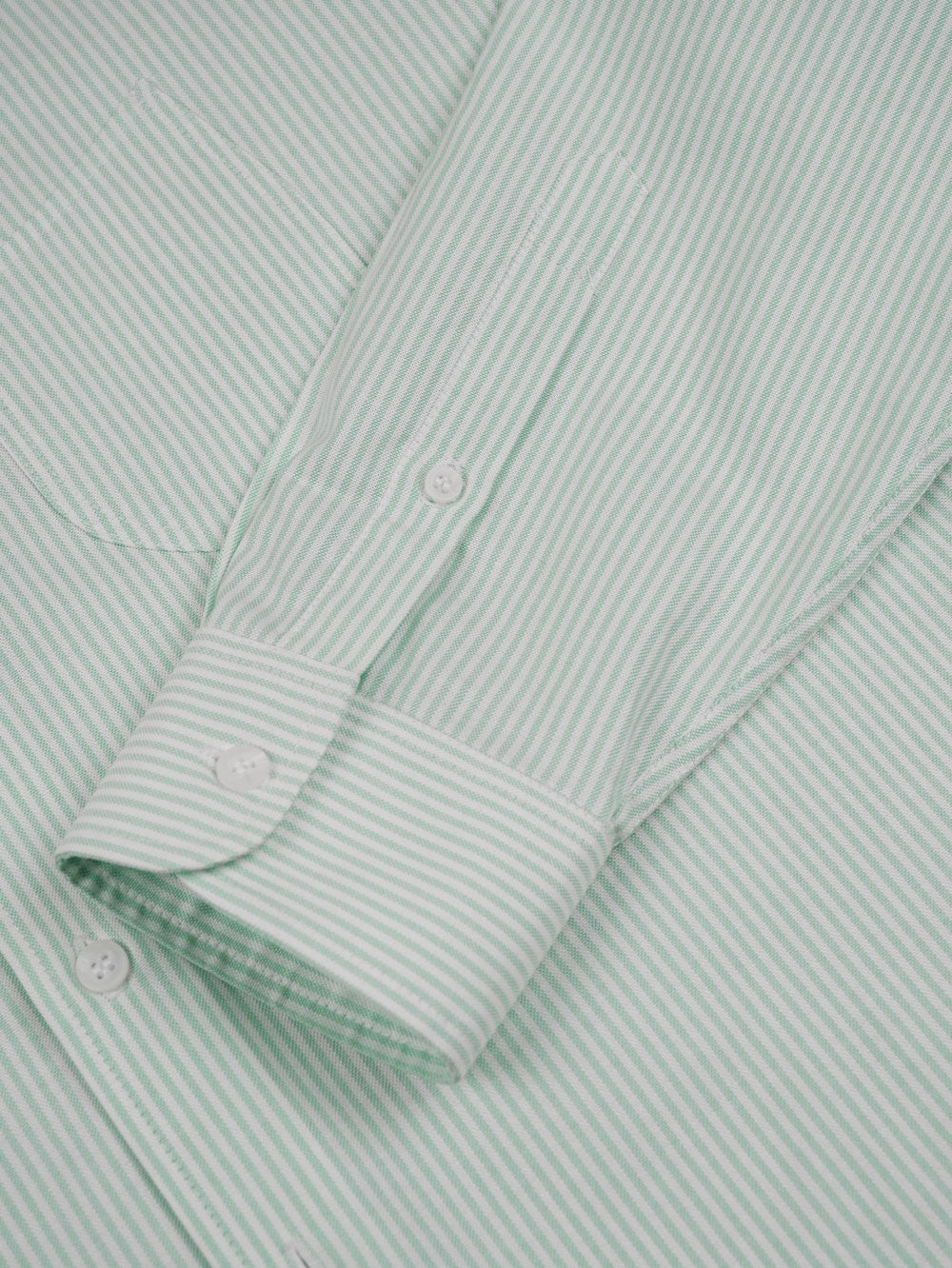 Crafted from Albiate's premium American Oxford cotton, this long-sleeve shirt delivers timeless elegance with contemporary flair. The subtle mint green and white striping adds visual interest without compromising versatility, while the signature barchetta pocket provides authentic tailoring detail.