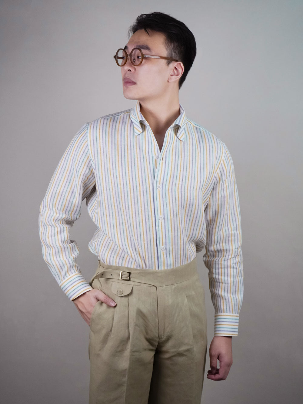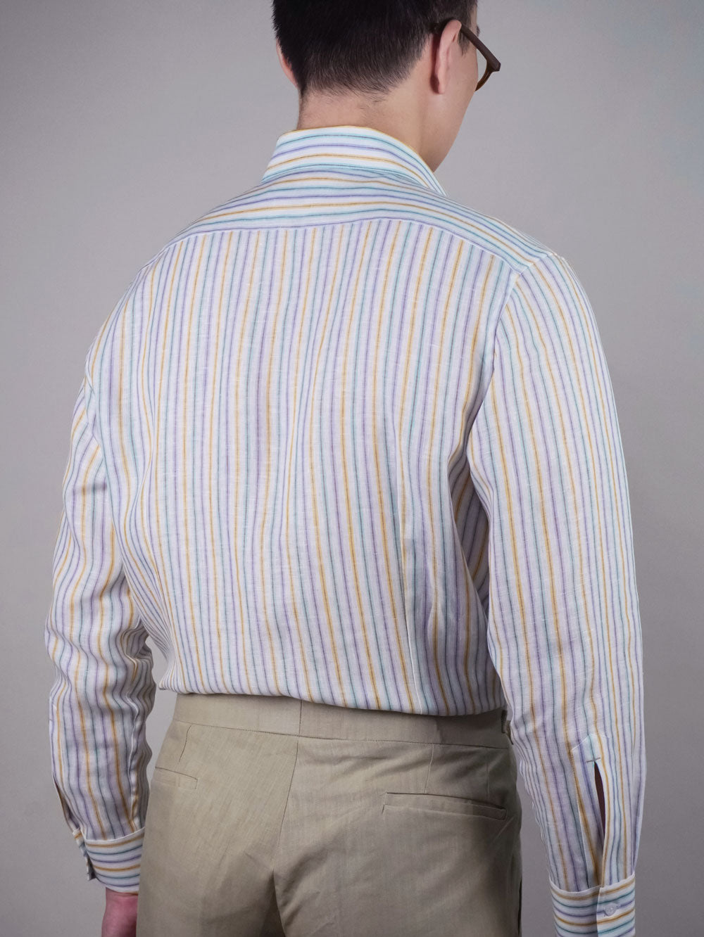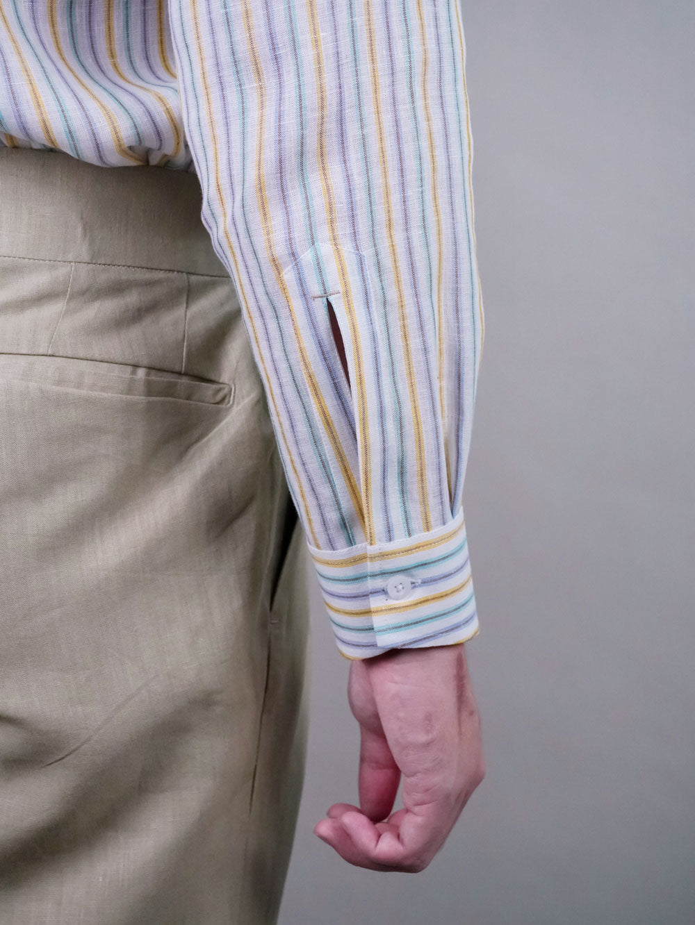 This sophisticated business shirt is tailored from the finest Thomas Mason Sahara Linen, a fabric known for its unparalleled quality and timeless appeal. Reowned as a classic linen staple, Sahara Linen combines the perfect balance of softness, lightness and a crisp, refined finish, making it ideal for warm weather or a smart, casual look. The fabric features a vibrant interplay of blue, green and yellow stripes, adding a touch of colour and personality while maintaining a polished, professional aesthetic.