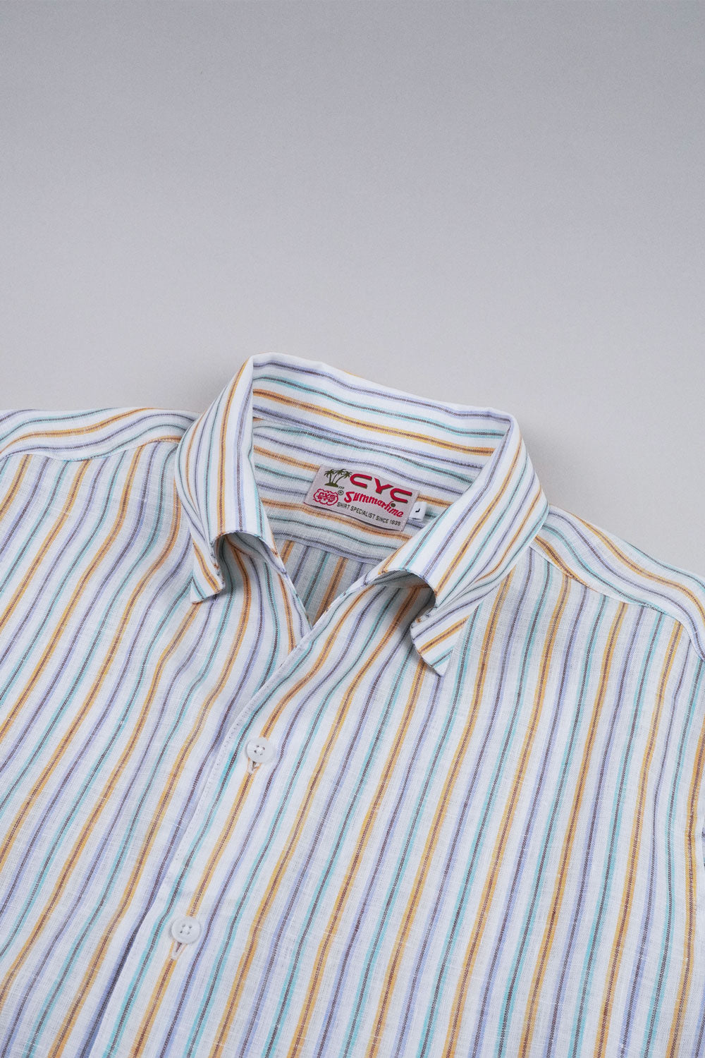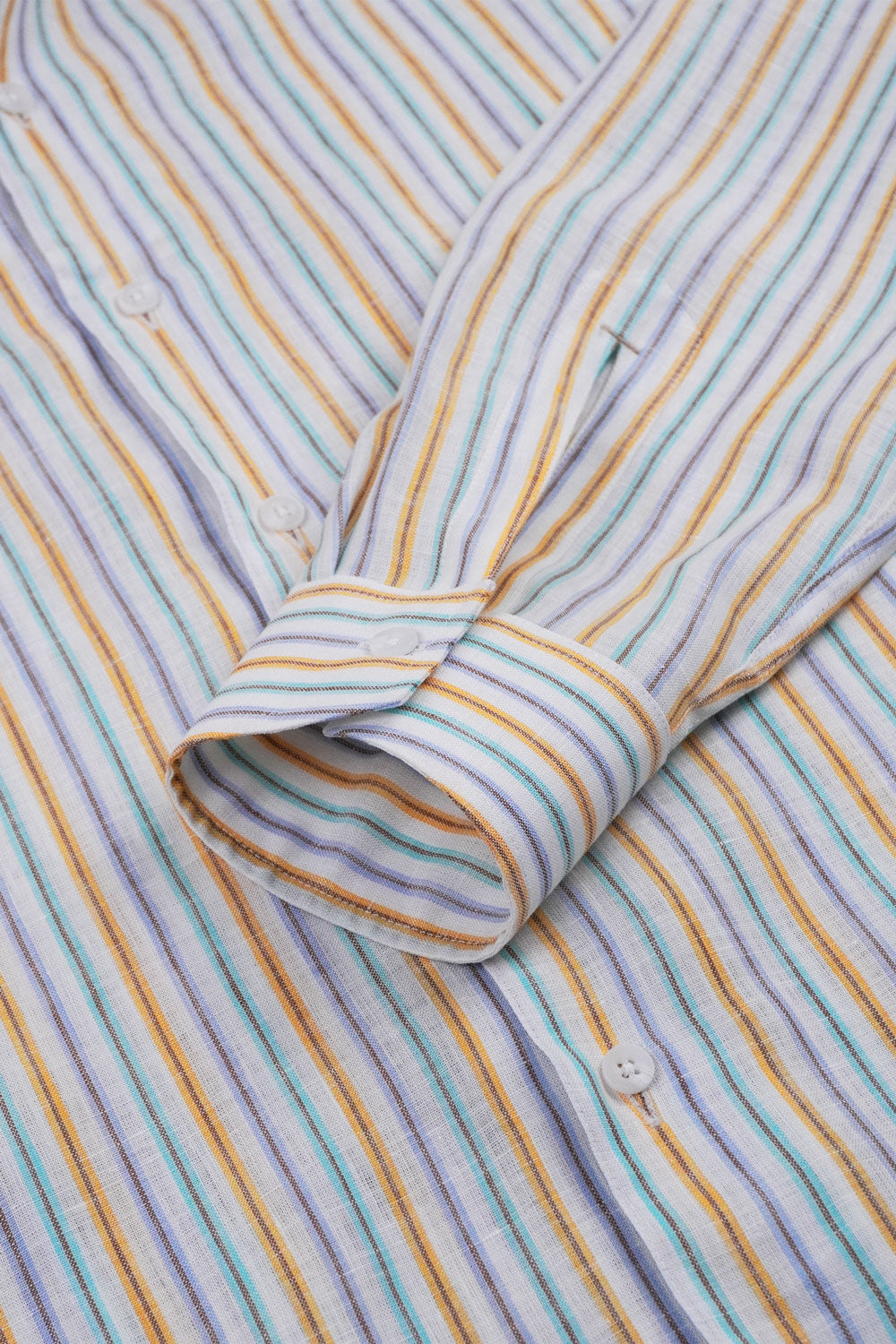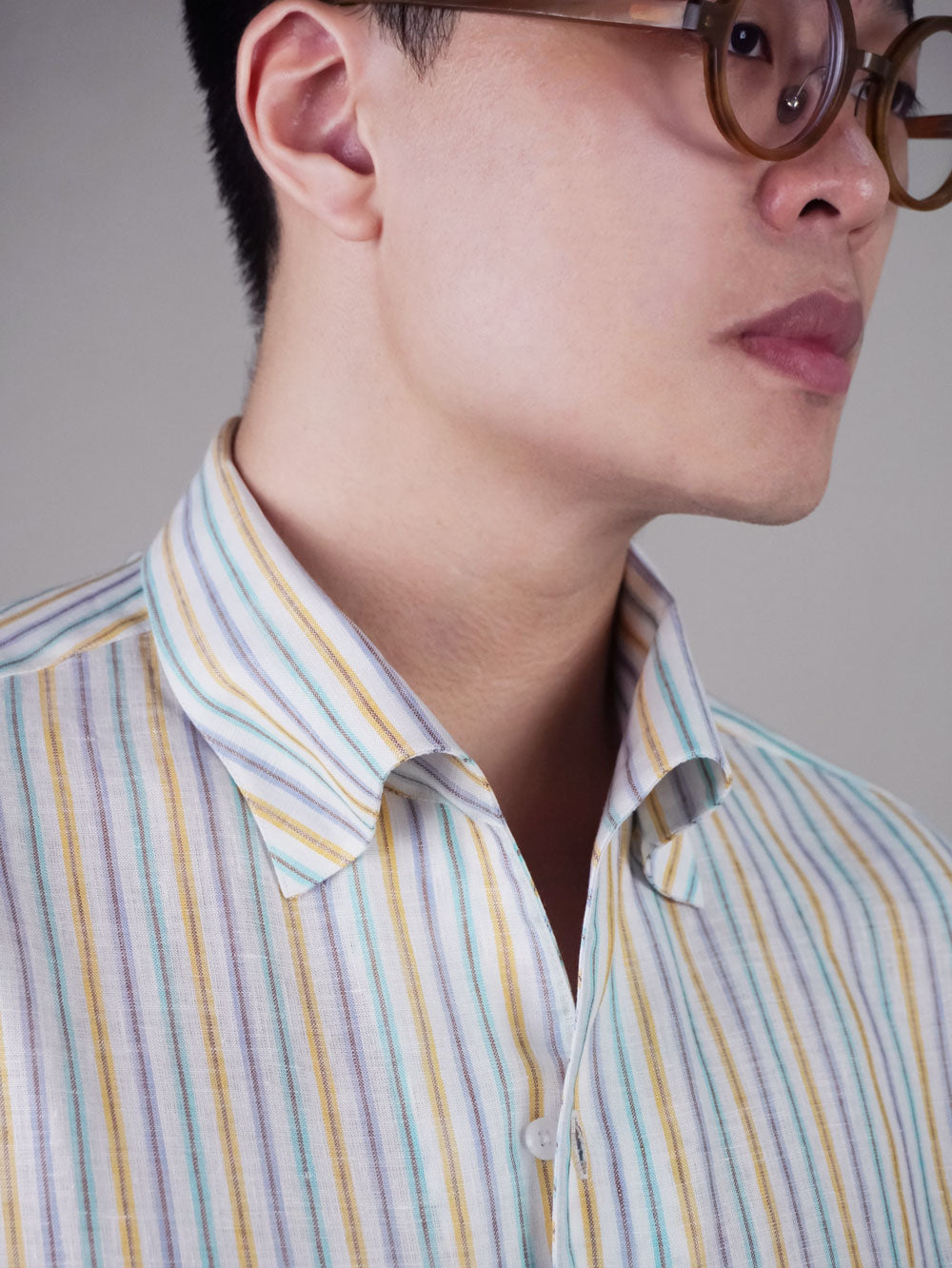 This sophisticated business shirt is tailored from the finest Thomas Mason Sahara Linen, a fabric known for its unparalleled quality and timeless appeal. Reowned as a classic linen staple, Sahara Linen combines the perfect balance of softness, lightness and a crisp, refined finish, making it ideal for warm weather or a smart, casual look. The fabric features a vibrant interplay of blue, green and yellow stripes, adding a touch of colour and personality while maintaining a polished, professional aesthetic.