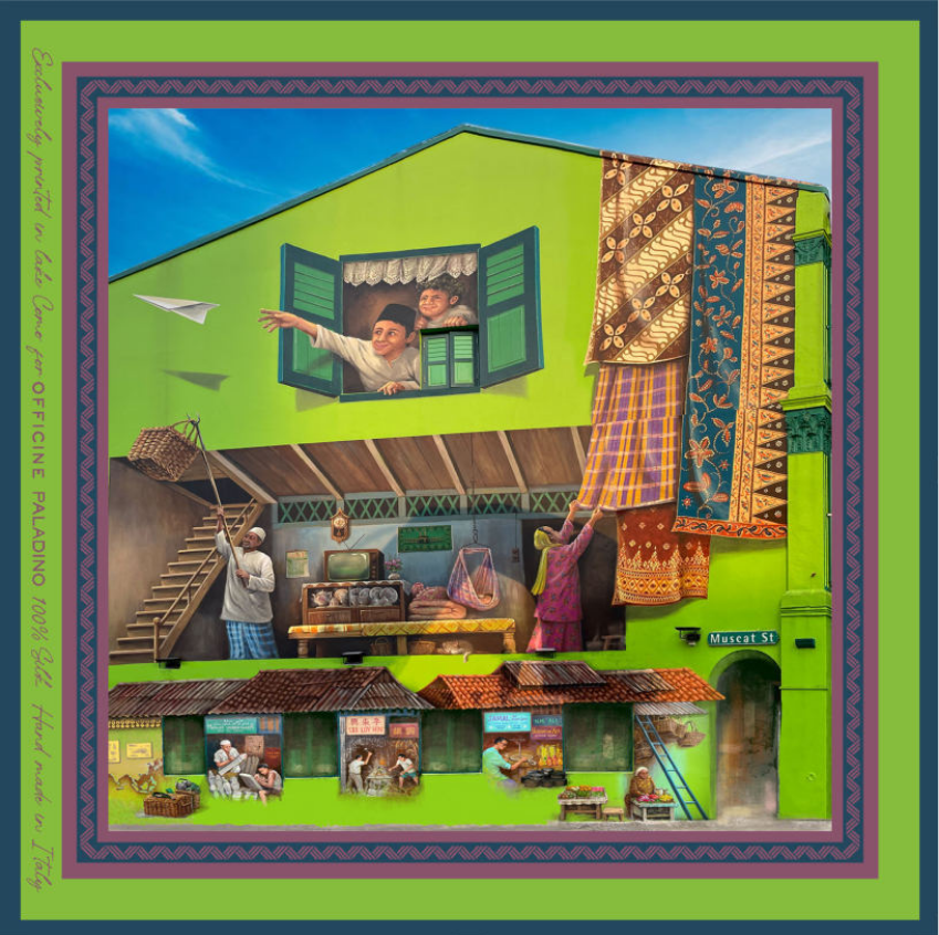 The Officine Paladino neckerchief is a vibrant homage to heritage and community life. Set against a rich blue, lime-green and purple border, the design features a striking lime-green shophouse facade alive with everyday scenes, children at the window launching a paper plane, woven textiles draped over the balcony and a bustling interior filled with warmth and tradition.