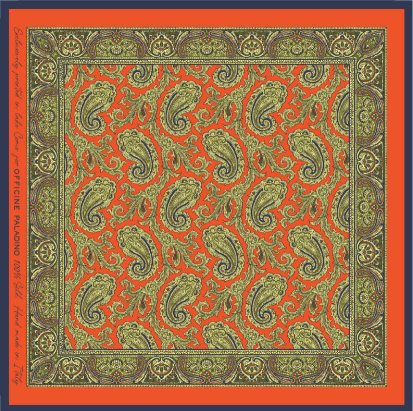 The Officine Paladino neckerchief is a timeless expression of pattern and colour. Set against a vibrant orange background, intricate paisley motifs unfurl with graceful rhythm, their curves evoking both movement and tradition. A refined blue border, deep yet luminous, frames the design and lends balance to the boldness of the palette.