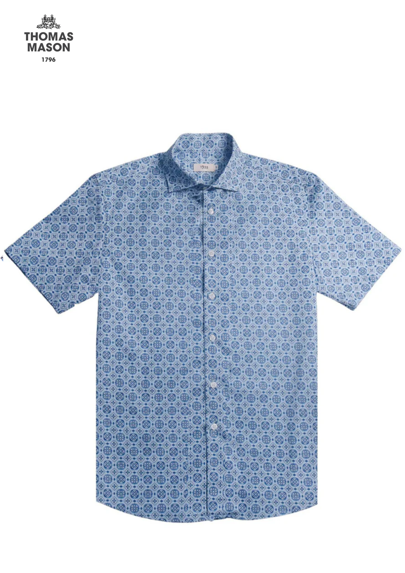 A Thomas Mason printed shirt — this casual short-sleeve shirt is made up of Nitik Batik, which means to make a dot. It is a specific kind of batik design composed of several tiny square dots placed repetitively in a pattern.
