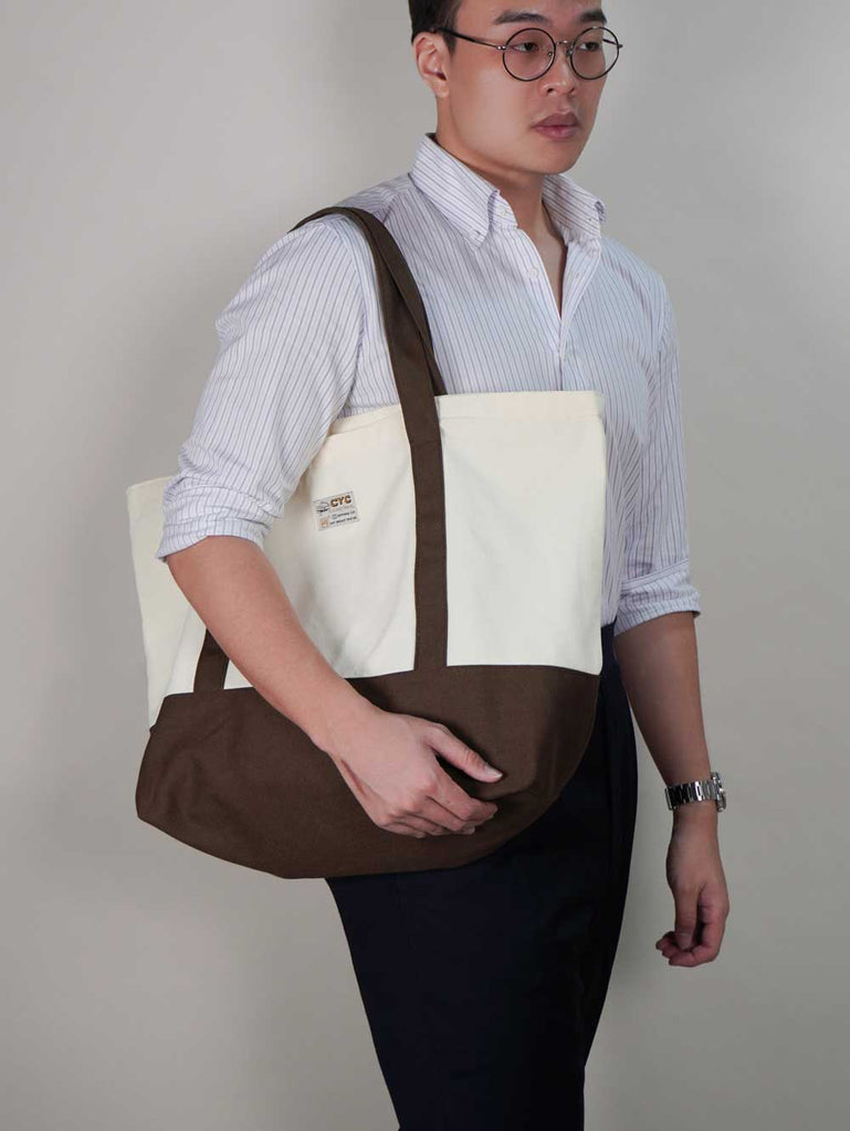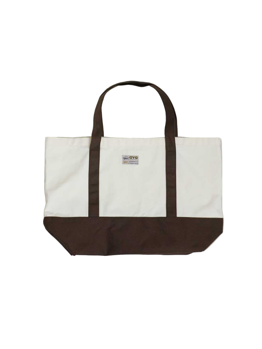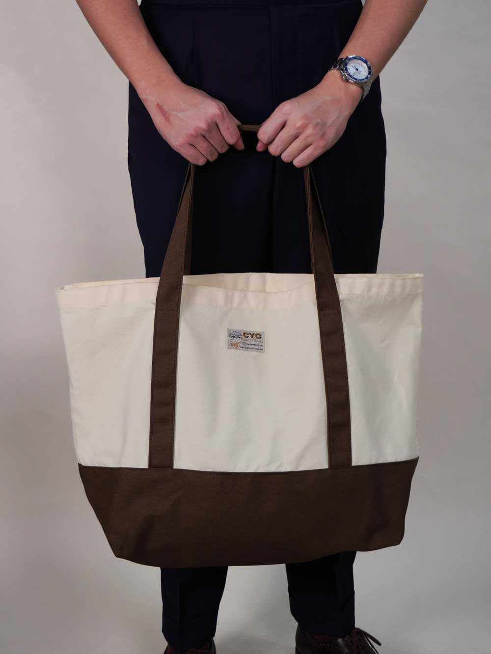 Elevate your everyday essentials with this tote bag. This large two-tone canvas tote pairs a natural-coloured body with brown accents on the handles and base for a clean, everyday look. Cut from sturdy canvas with a spacious main compartment, it’s made for leisure. A quiet nod to our history comes through in the archive-inspired labels—faithful reproductions of CYC labels from over the years.