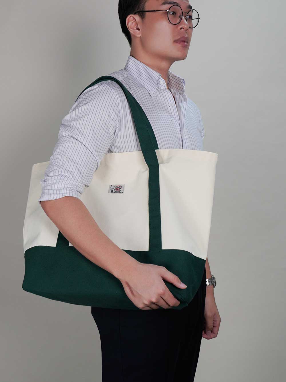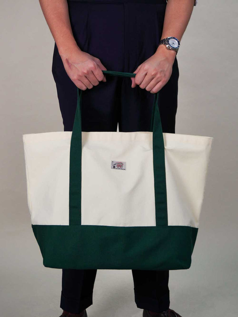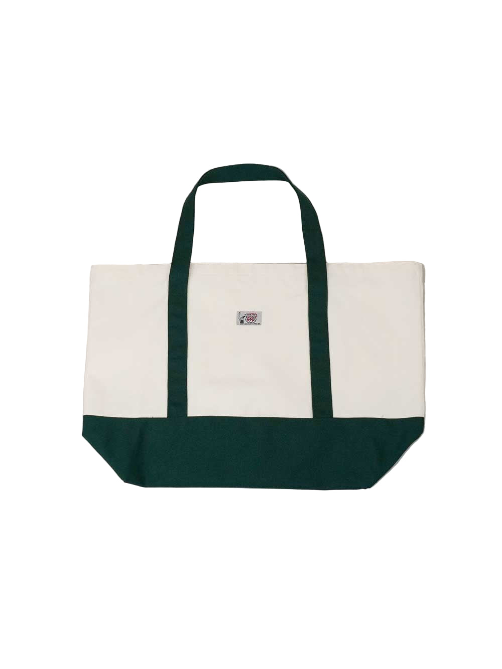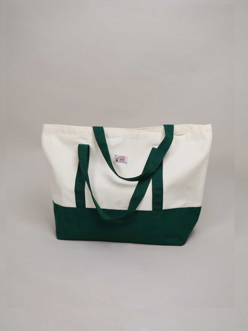 Elevate your everyday essentials with this tote bag. This large two-tone canvas tote pairs a natural-coloured body with green accents on the handles and base for a clean, everyday look. Cut from sturdy canvas with a spacious main compartment, it’s made for leisure. A quiet nod to our history comes through in the archive-inspired labels—faithful reproductions of CYC labels from over the years.