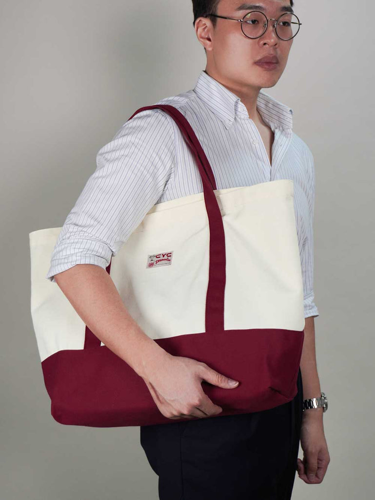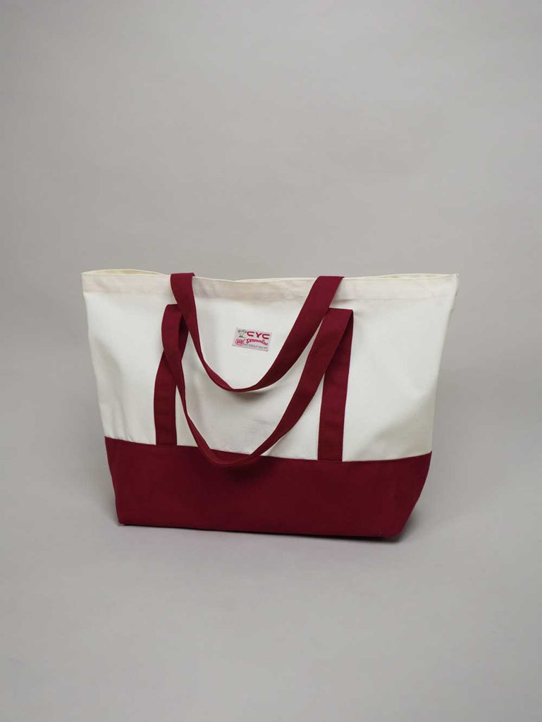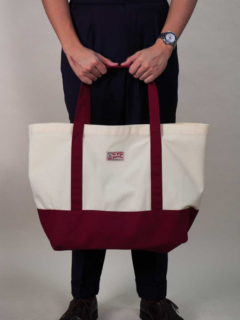 Elevate your everyday essentials with this tote bag. This large two-tone canvas tote pairs a natural-coloured body with red accents on the handles and base for a clean, everyday look. Cut from sturdy canvas with a spacious main compartment, it’s made for leisure. A quiet nod to our history comes through in the archive-inspired labels—faithful reproductions of CYC labels from over the years.