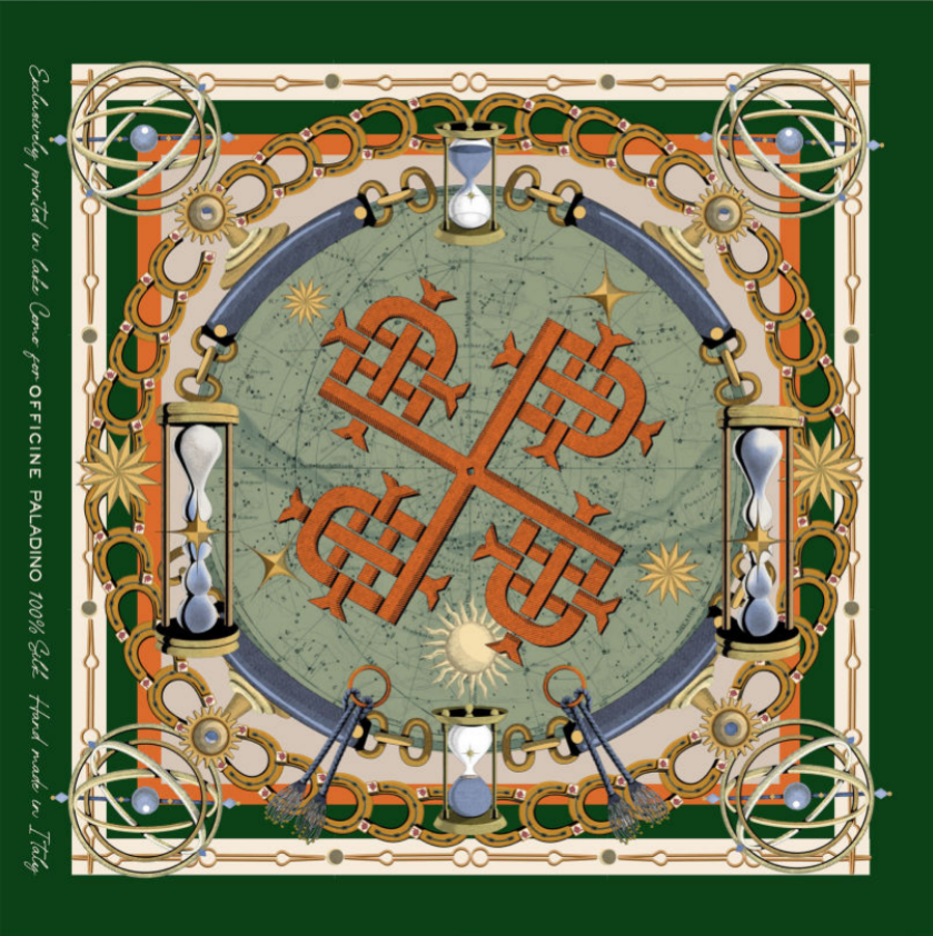 The Officine Paladino neckerchief presents a captivating blend of artistry and heritage. It is rendered with a dominant deep forest green border and a central field of muted, aged teal, featuring an elaborate orange-gold motif reminiscent of interwined keys or an ornate cross. The motif is set against a celestial map background, complete with faint star constellations and a radiant sun icon. The inner border showcases a chain-link pattern interspersed with golden horseshoes, hourglasses and astronomical instruments, all connected by delicate chains, evoking a sense of historical and astrological narrative.