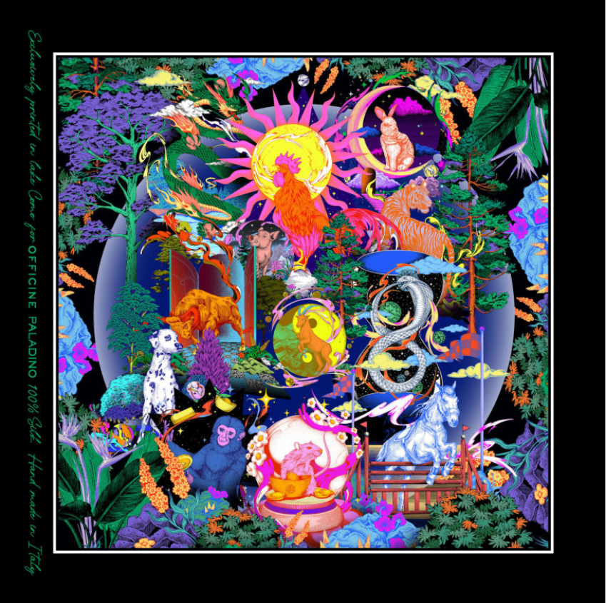 The Officine Paladino neckerchief bursts with vivid imagination and colour, framed by a sleek black border that draws focus to its striking centre. The design is a fantastical tableau alive with symbolic animals and lush foliage, rendered in a kaleidoscope of neon-like hues. The design presents a fantastical interpretation of the 12 Chinese zodiac animals appearing within the surreal landscapes.