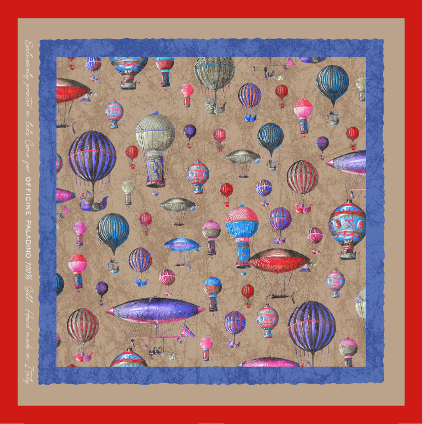 The Officine Paladino pocket square combines elegance with playful charm. Framed by vivid red and beige borders, the central design showcases a variety of hot air balloons floating across a textured background, each rendered with intricate patterns and vibrant details. A secondary blue textured border runs along the edge of the print, adding contrast and framing the whimsical scene.
