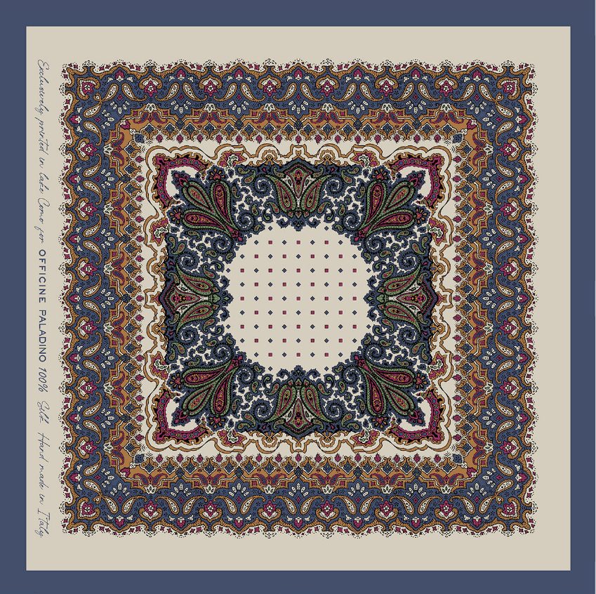 The Officine Paladino pocket square presents a richly detailed and ornate design framed by a deep blue outer border and a cream band. Within, layers of intricate borders unfold in tones of navy, gold, red and cream, each adorned with elaborate motifs that resemble floral and paisley-inspired patterns. At the centre, a circular field of alternating red and navy diamond shapes on a cream background is surrounded by bold, swirling paisley forms in deep blue, green and burgundy, creating a dramatic focal point.