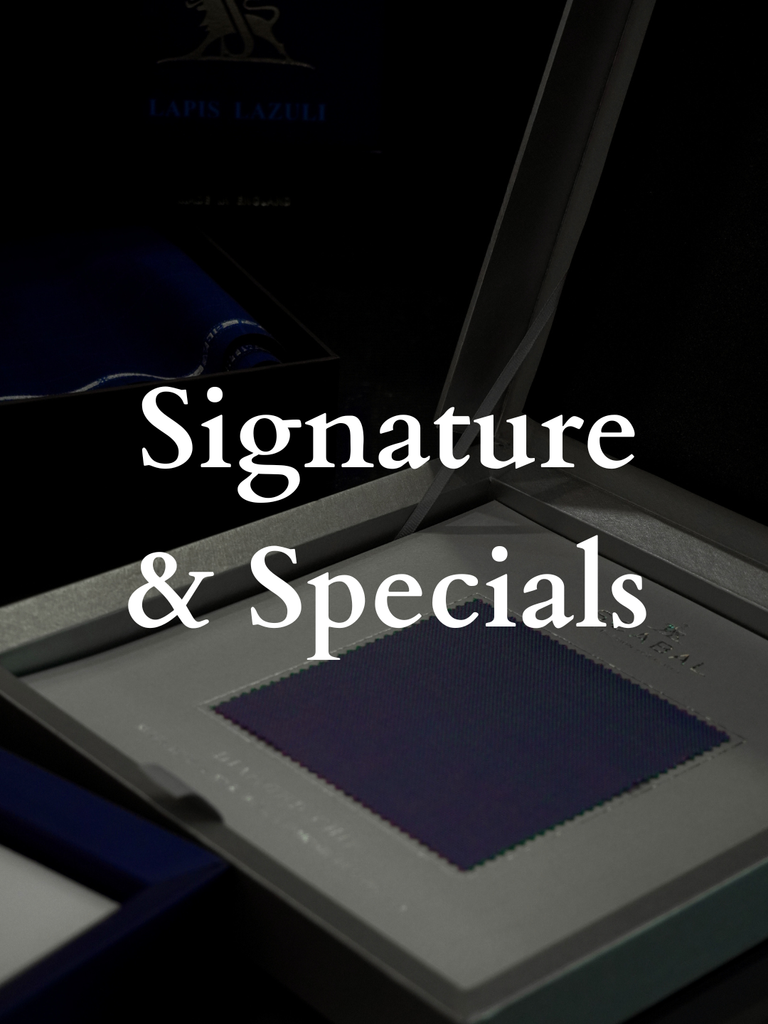 Where Scabal’s innovation and artistry meet. This segment features fabrics that push the boundaries of traditional weaving — incorporating rare materials such as diamond dust and gold, intricate textures, and inspired designs that transform cloth into conversation pieces.